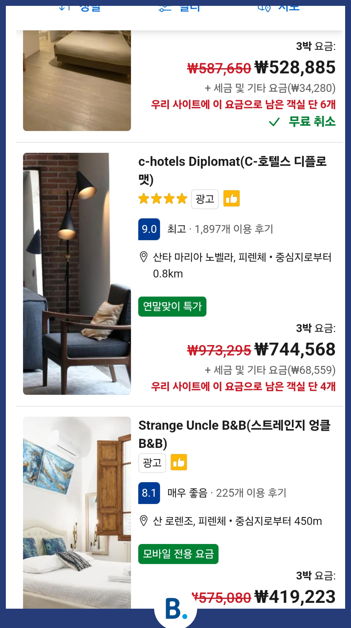 부킹닷컴 9월 프로모션코드가 적용된 특가에는 아래와 같이 <연말맞이 특가>, <기간한정 특가>, <모바일 전용 요금>이라고 표기가 됩니다. 특가가 적용된 숙소가 굉장히 많기 때문에 베트남, 대만, 태국, 일본 어디를 가든 아마 원하시는 숙소 하나 정도는 있을 거예요. 국내 호텔과 해외 호텔 모두 적용이 되어 있으니 한번 잘 살펴보시길 바랍니다.