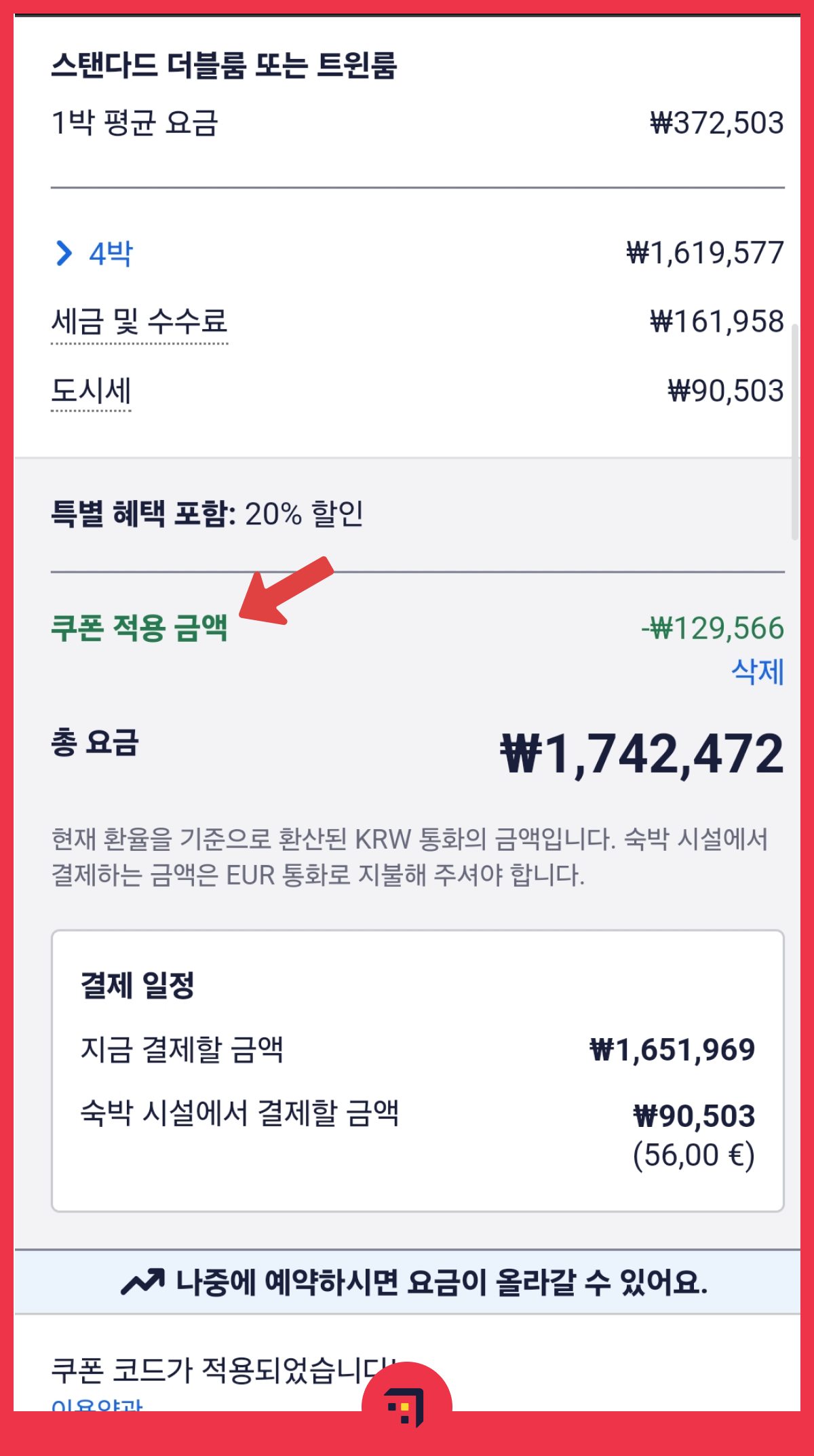 할인된 금액은 총 결제 금액에 바로 적용이 되어 할인된 가격으로 예약을 하실 수 있어요.
