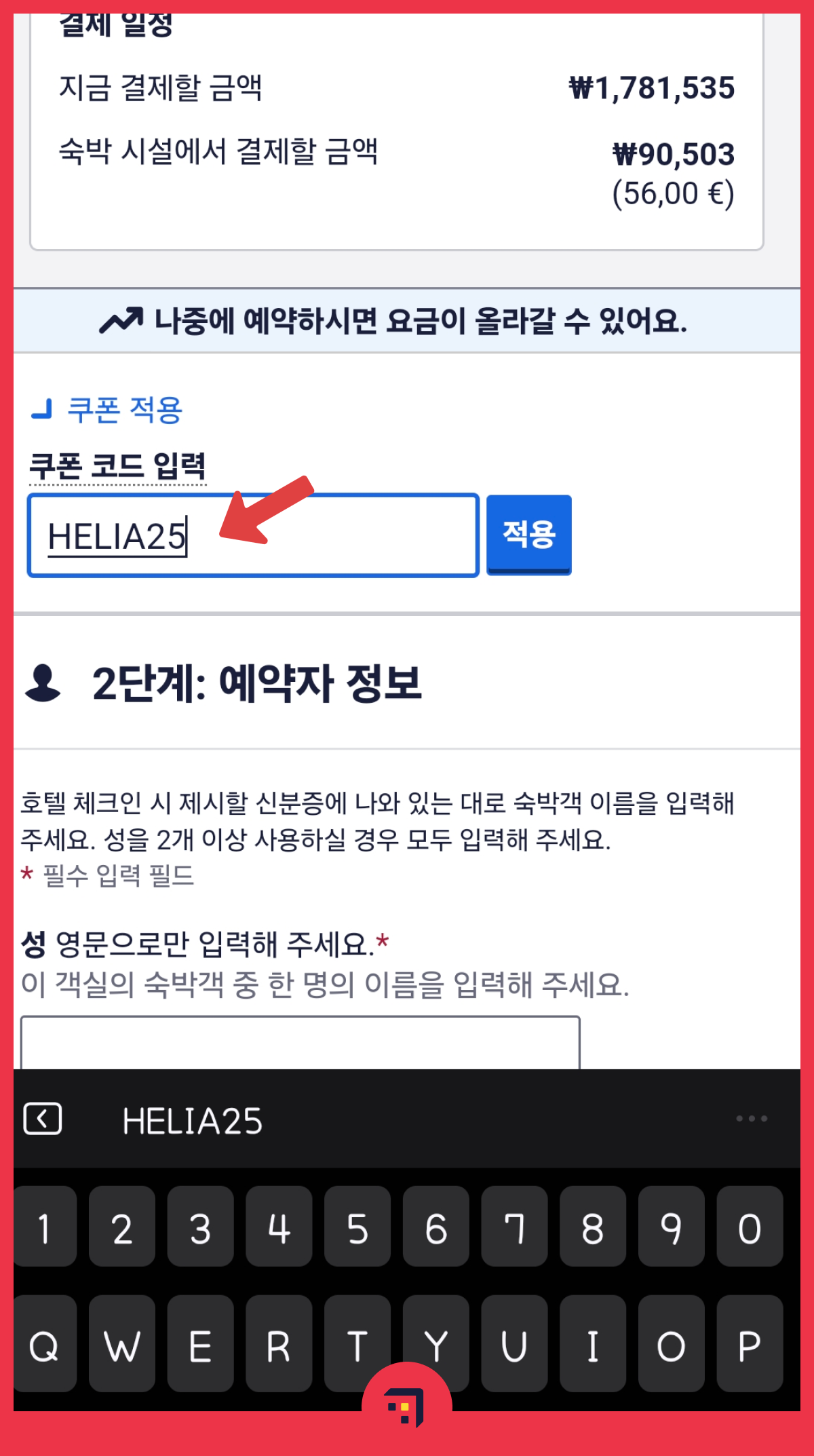 여기에 호텔스닷컴 11월 쿠폰 HELIA25를 입력하고 '적용' 버튼을 클릭하면 즉시 할인이 적용됩니다.