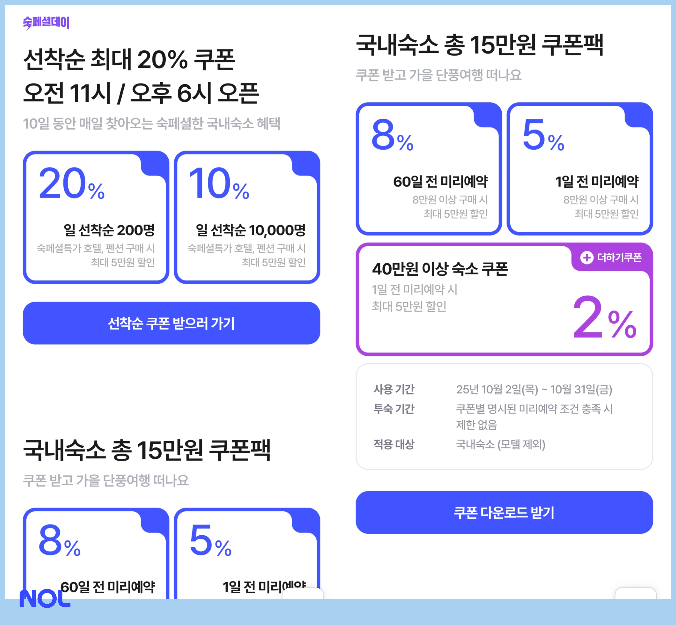 그럼 숙박페스타를 비롯해서 NOL야놀자 10월 쿠폰 등 소개해 드릴게요!